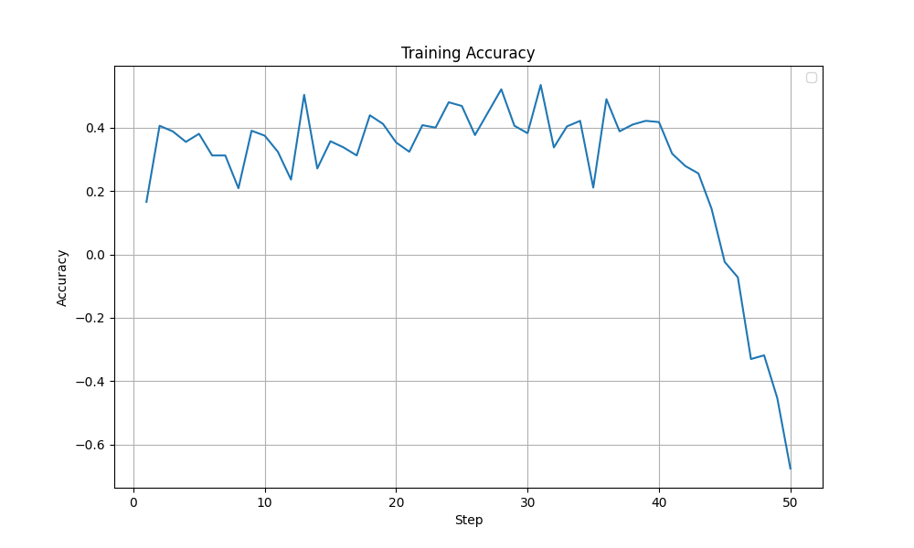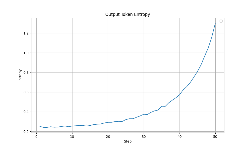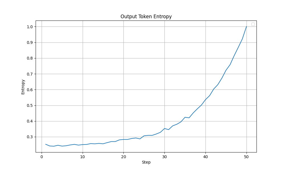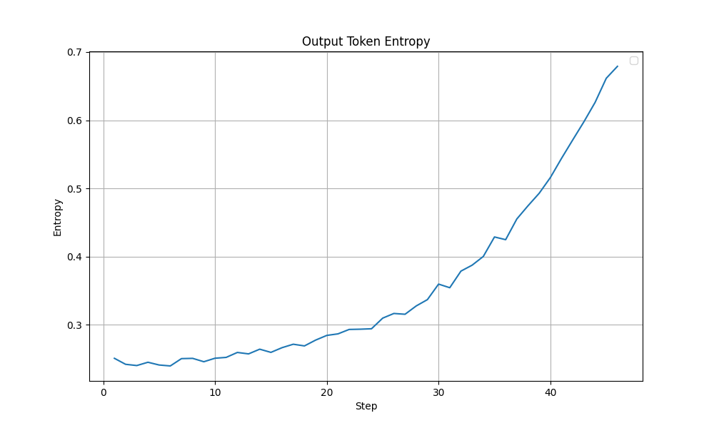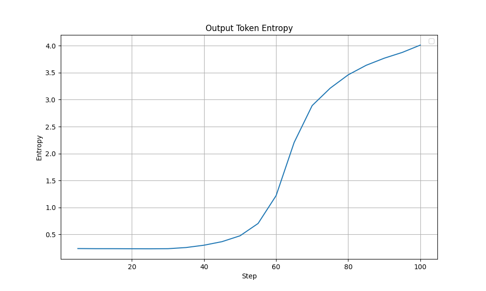 Looking through the training logs, I observed something interesting. The model’s output token entropy exploded around the 50-60 step mark. This coincides with a drop in training accuracy after a plateau that lasted from around step 30. Ideally, the model’s entropy should show a more steady trend since entropy going too high (random tokens) or too low (repetitive tokens) can lead to model collapse.