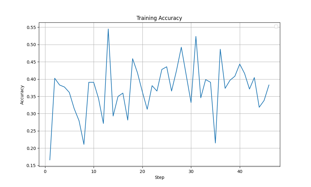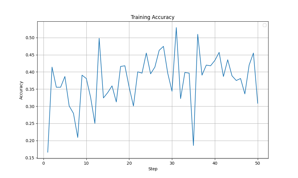 In this experiment, the entropy was better behaved (peaks at ~1.0 with a more steady increase compared to the previous ~4.0). Other metrics like the grad norm and the training loss were also relatively stable. More importantly, the training accuracy improved steadily without any collapse like it was observed before. The graphs are shown below. Overall, I felt this setting was close to optimal and is a good base to start tuning from.